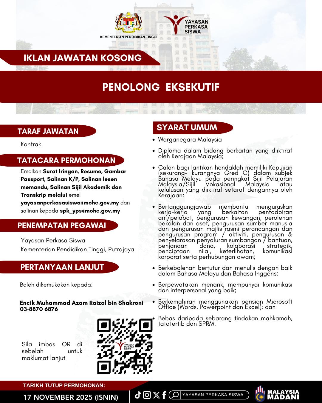Maklumat lanjut dan tatacara permohonan berkenaan jawatan-jawatan tersebut boleh diperolehi dengan mengimbas Kod QR yang terdapat pada poster hebahan yang disediakan. Tarikh tutup permohonan adalah pada 17 November 2025 (Isnin).